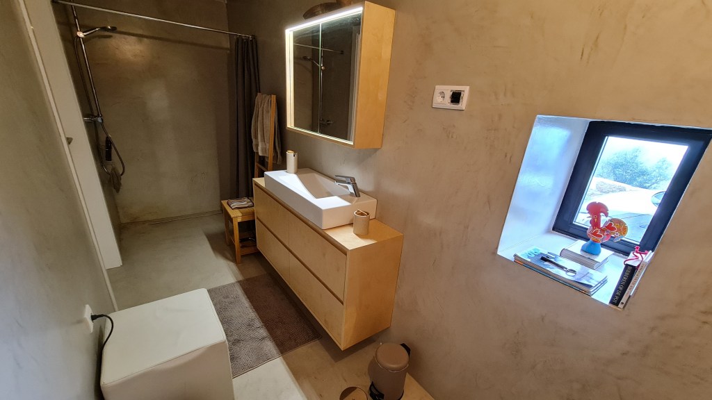 Het huisje is ideaal voor twee, maar in een uitklap sofa in de living kunnen nog twee mensen slapen en er is een matres voor de ‘stal’. Er is een tafel en bestek voor 8. De panoramische ramen geven zicht op de vallei ten westen van het huis. De gazon krijgt al snel de ochtendzon, het ruime terras warmt op in de zuiderzon en op het gras, terras of binnen geniet je van de ondergaande zon terwijl de platanen het huis van schaduw voorzien.